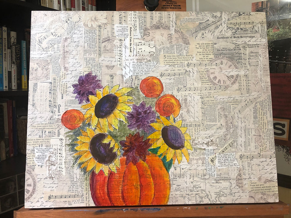Now I could still see the variety of papers, but they blended together better. I felt the background would no longer distract from the flower arrangement I was going to add.