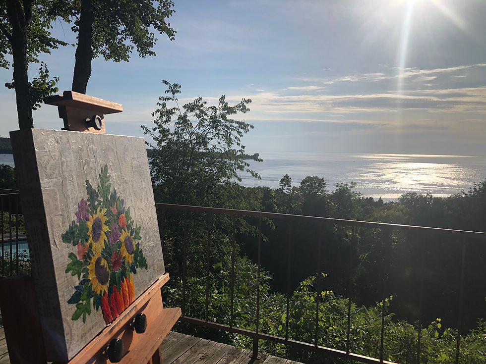 After a morning of shopping and galleries, I was inspired! I set it up and got to work. It was so much fun to be on our room's deck at Egg Harbor Lodge. A truly inspiring place to create with a beautiful view of the bay!