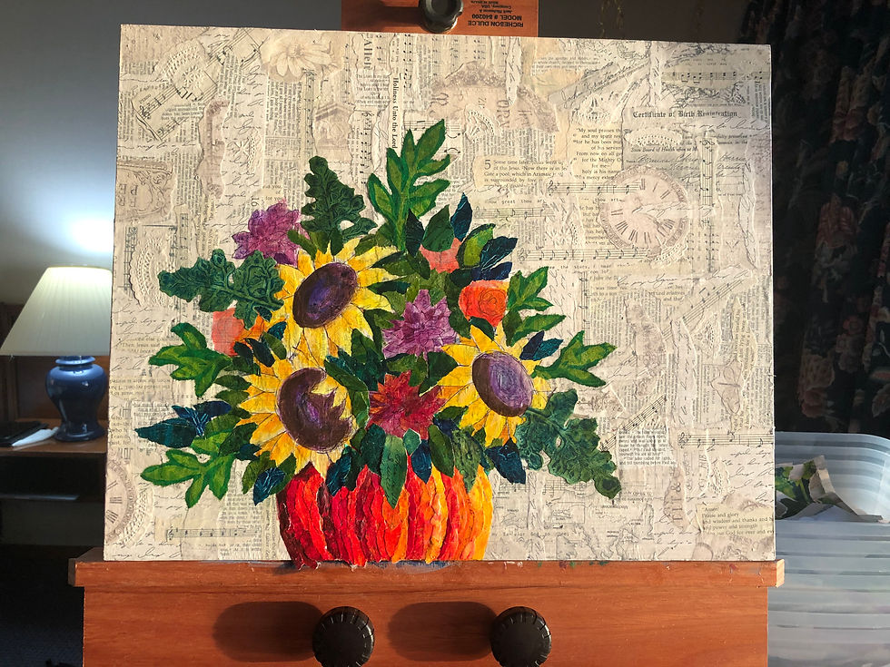 I did not like my "folded over sunflower on the bottom left so I added more blue paper over it to recreate it facing front. Then I laid the painting on the floor so I could audition some options to complete it. First, I tried some large red berries: